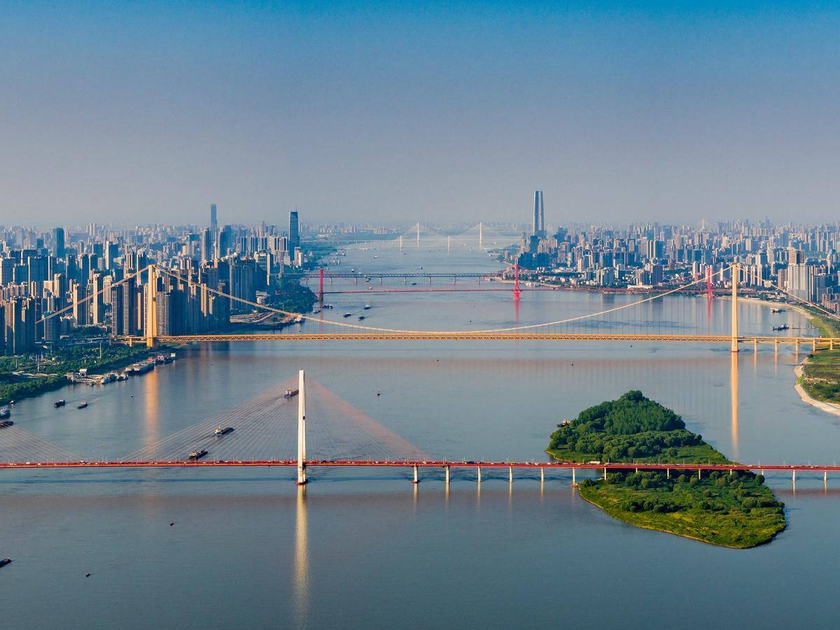 从高空俯瞰长江武汉段,水清岸美,6座跨江大桥尽收眼底。(湖北日报全媒记者 柯皓 摄)