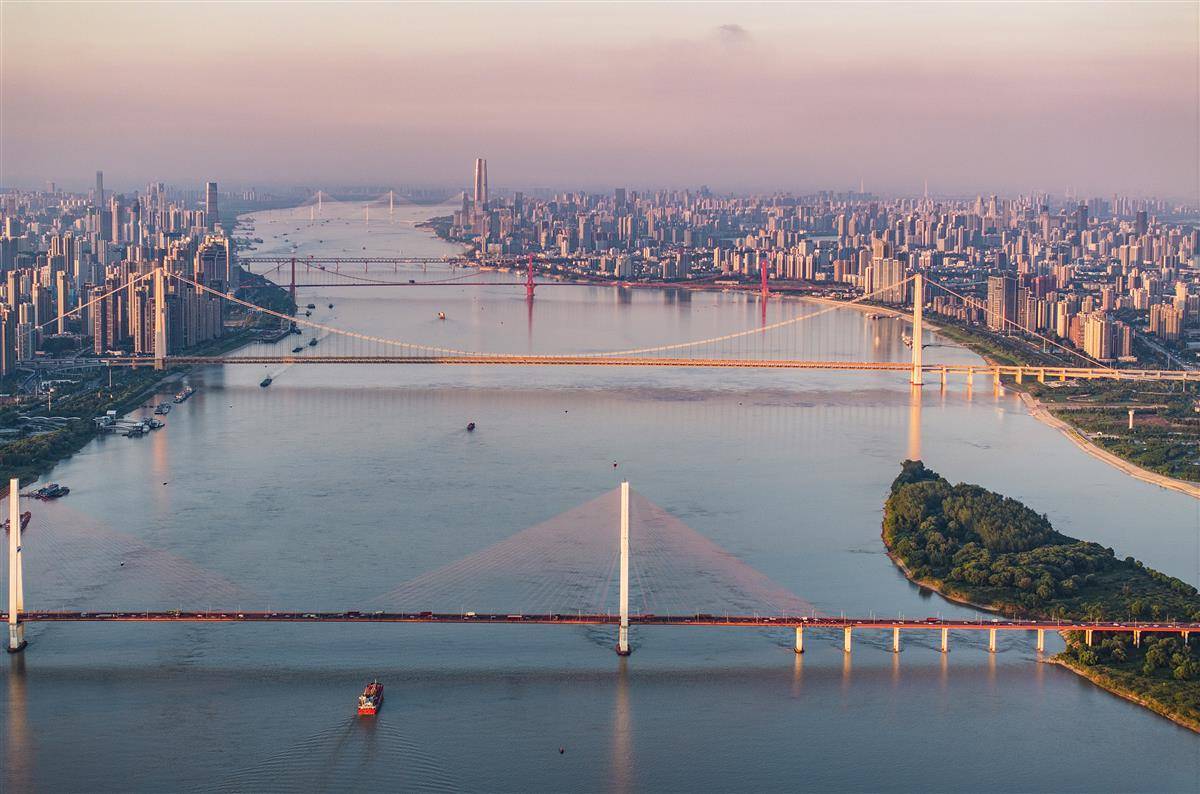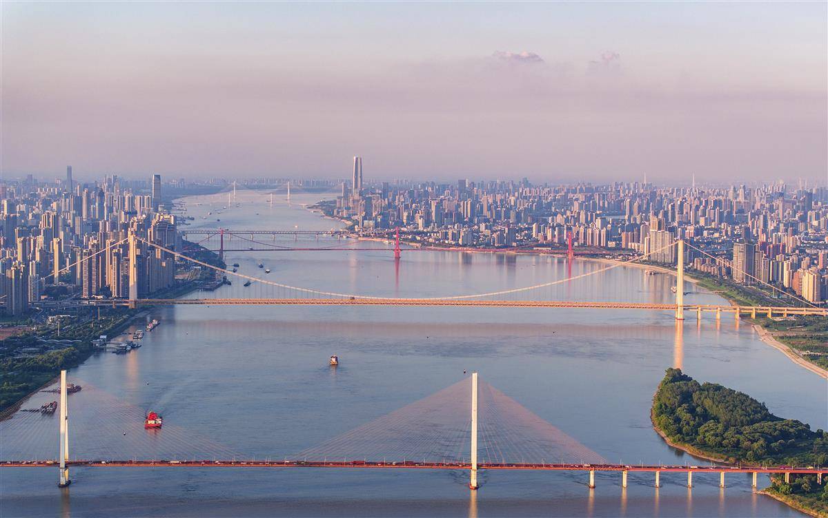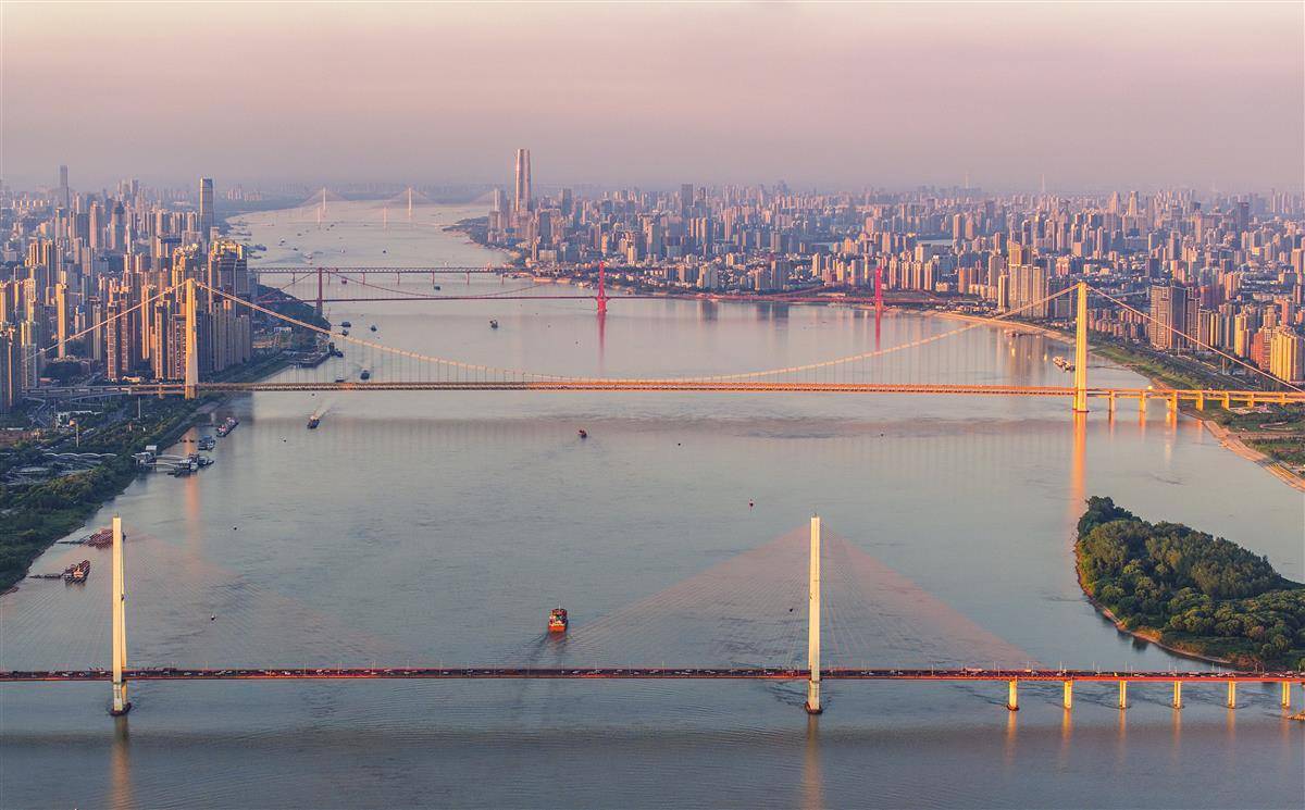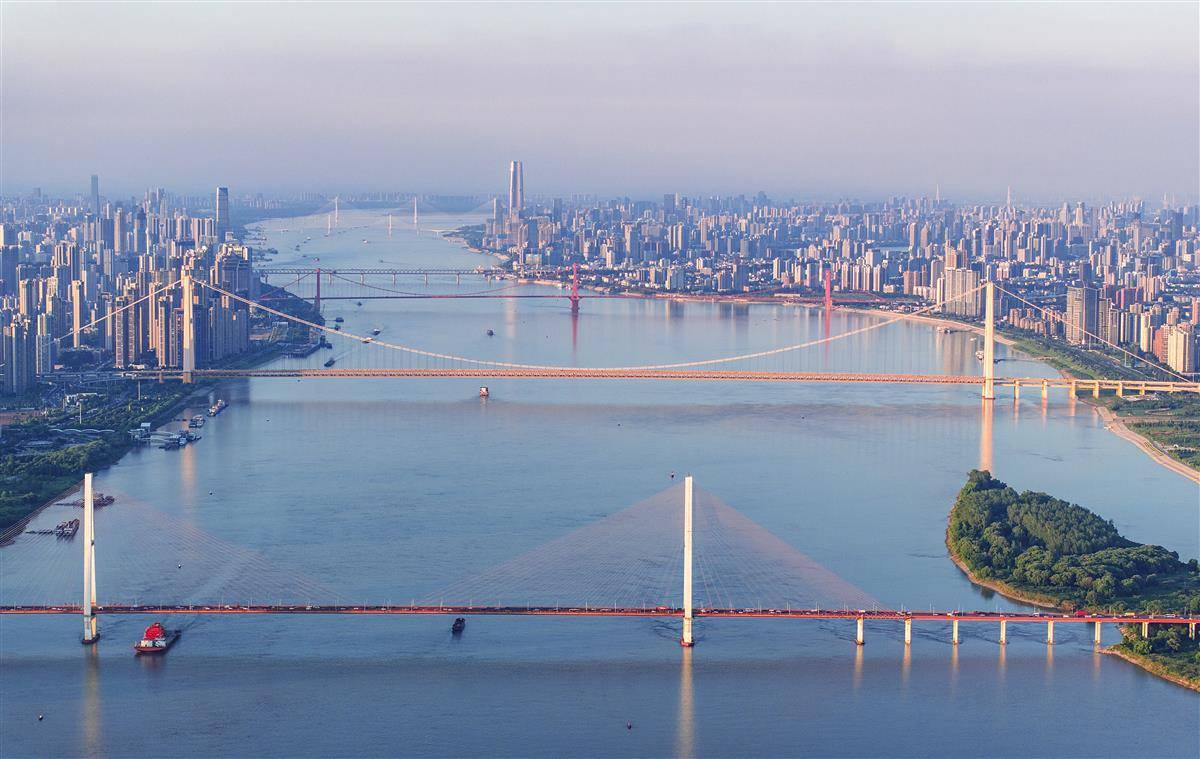 8月18日,武汉中心气象台又发布高温橙色预警,但武汉天空能见度很高,难得一见的通透性,一眼可望近30公里。当日傍晚,无人机在白沙洲长江大桥上游起飞,从500米高空鸟瞰武汉的长江大桥,八座长江大桥一图全收。(由近到远为:白沙洲长江大桥、杨泗港长江大桥、鹦鹉洲长江大桥、武汉长江大桥、武汉长江二桥、二七长江大桥、天兴洲长江大桥、青山长江大桥。)航拍视角带你一睹桥都——武汉的壮丽景象。(湖北日报全媒记者 朱熙勇 摄)