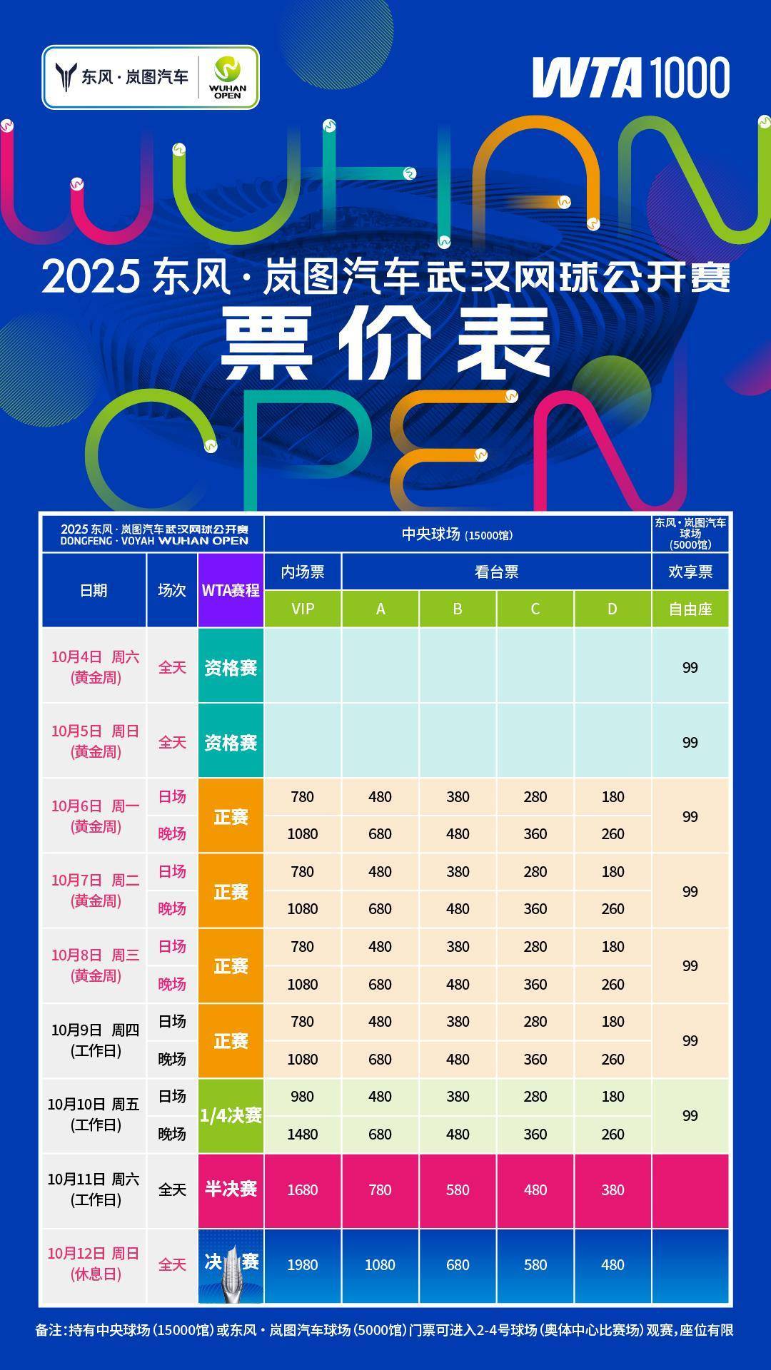 组委会精心设计了多重档位的票价,力求满足每位观众的需求。中央球场、东风·岚图汽车球场独立售票,中央球场分内场VIP票、A/B/C/D四档看台票,看台票从180元到1080元不等,VIP票从780元到1980元不等,分为日、晚场,半决赛及决赛不分场。另外,东风·岚图汽车球场“欢享票”99元。凡持有中央球场、东风·岚图汽车球场门票的人员可进入奥体中心比赛场观赛。