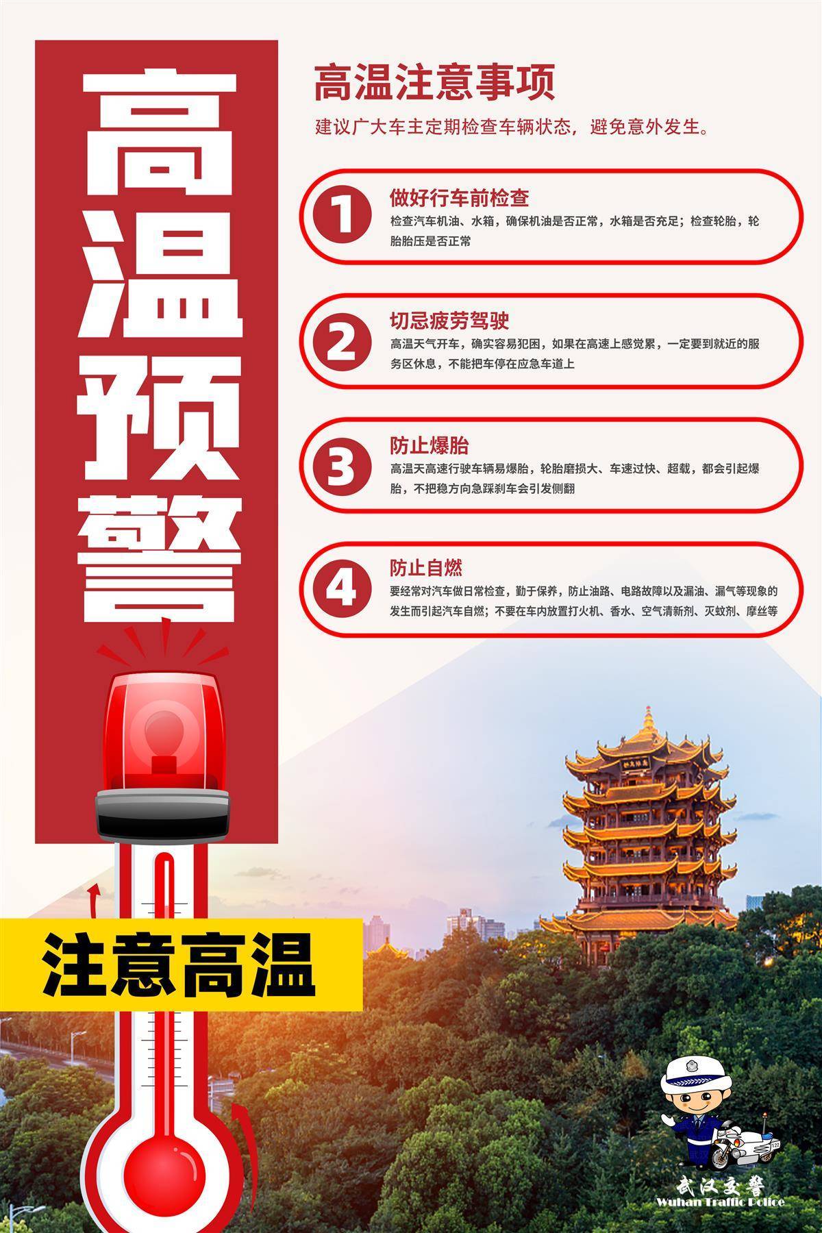 高温炙烤,安全至上。武汉交警再次提醒广大车主,做好车辆日常检查维护,熟知应急处置流程,远离车内危险物品,让平安成为您夏日行车最坚实的保障。