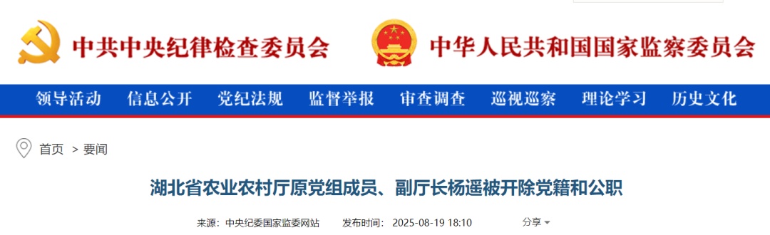 据湖北省纪委监委消息:经湖北省委批准,湖北省纪委监委对省农业农村厅原党组成员、副厅长杨遥严重违纪违法问题进行了立案审查调查。