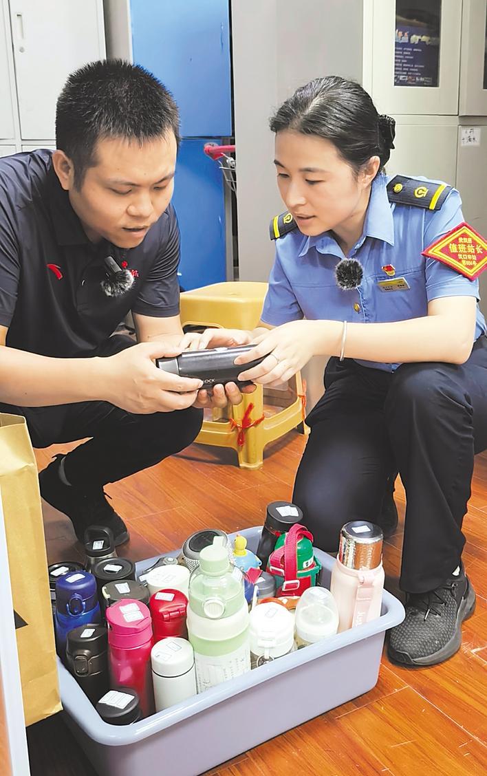湖北日报全媒记者林晶和值班站长席珊珊(右)一起找水杯。(湖北日报实习生 于若轩 摄)