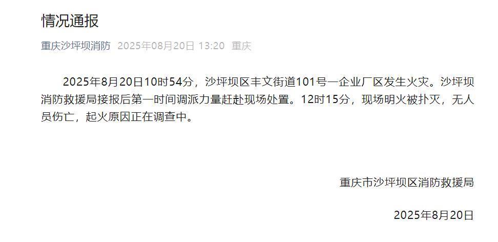 重庆市沙坪坝区消防救援局就此事发布情况通报称,2025年8月20日10时54分,沙坪坝区丰文街道101号一企业厂区发生火灾。沙坪坝消防救援局接报后第一时间调派力量赶赴现场处置。12时15分,现场明火被扑灭,无人员伤亡,起火原因正在调查中。