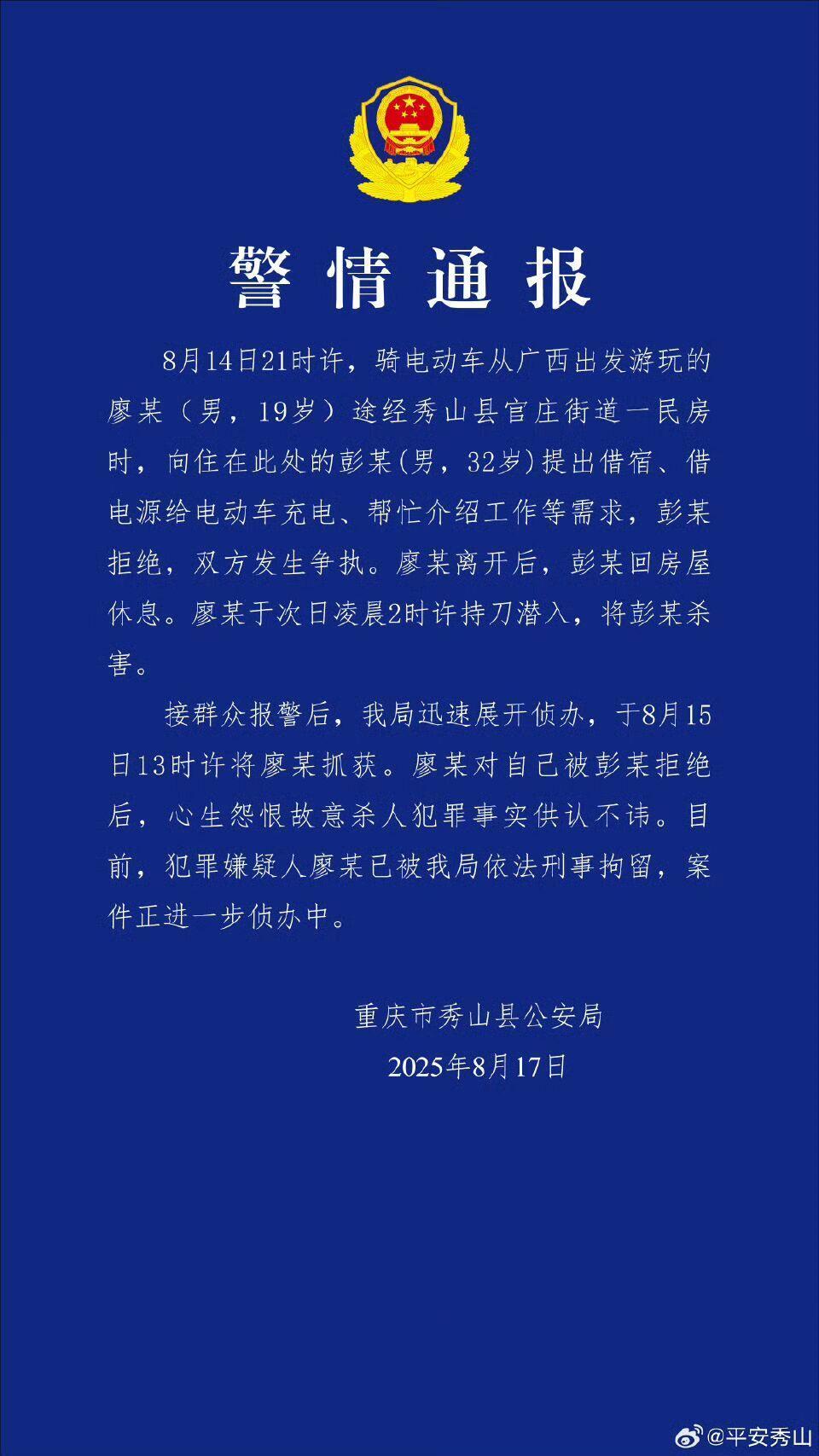 据重庆市秀山县公安局8月17日通报,8月14日21时许,骑电动车从广西出发游玩的廖某(男,19岁)途经秀山县官庄街道一民房时,向住在此处的彭某(男,32岁)提出借宿、借电源给电动车充电、帮忙介绍工作等需求,彭某拒绝,双方发生争执。廖某离开后,彭某回房屋休息。廖某于次日凌晨2时许持刀潜入,将彭某杀害。接群众报警后,秀山县公安局迅速展开侦办,于8月15日13时许将廖某抓获。廖某对自己被彭某拒绝后,心生怨恨故意杀人的犯罪事实供认不讳。目前,犯罪嫌疑人廖某已被秀山县公安局依法刑事拘留,案件正在进一步侦办中。