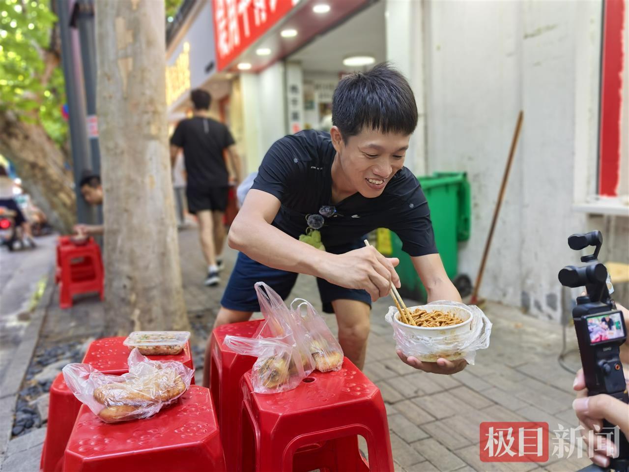 和武汉本地人一样,刘世鑫提着早餐,找了一个小板凳,坐在路边过早。“朋友们,豆皮有点像台湾的油饭,还有香菇的味道,一口下去很满足!这个热干面好筋道,和台湾的麻酱面有点像,好吃。再看这个糯米鸡,感受一下它的重量,果然是碳水之都……”刘世鑫一边解说,一边形容每一份早餐的味道。最后,他给想来武汉游玩的朋友们总结分享,“一定要空着肚子早点来!”