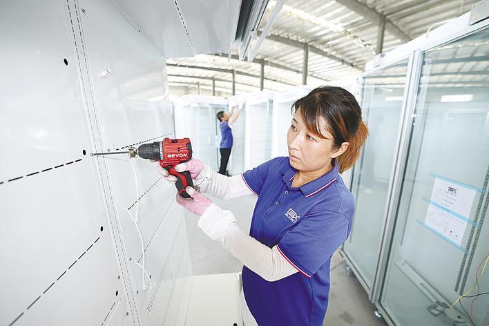 天门顾翔制冷设备有限公司生产车间内,工人正在进行风幕柜组装。 (湖北日报通讯员 刘银斌 摄)