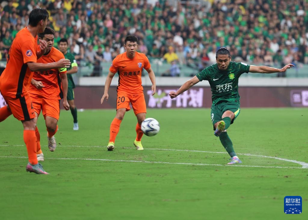 8月20日,北京国安队球员张玉宁(右一)在比赛中射门。