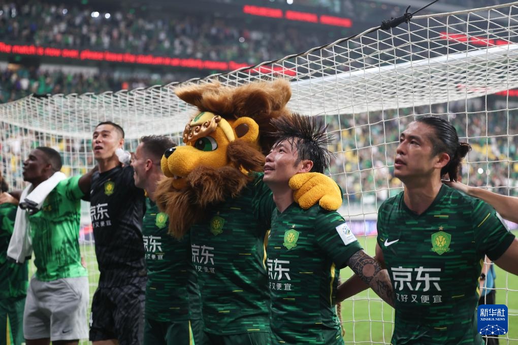 8月20日,北京国安队球员在比赛后庆祝。