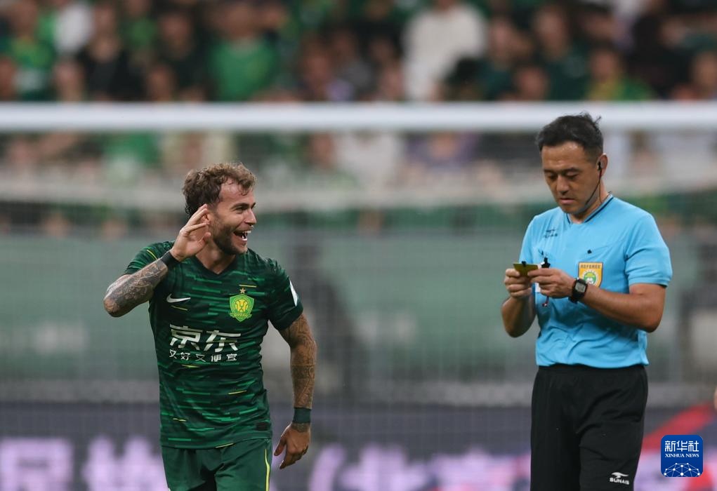 8月20日,北京国安队球员贡萨洛(左)等待主裁判刘威宣布进球有效。