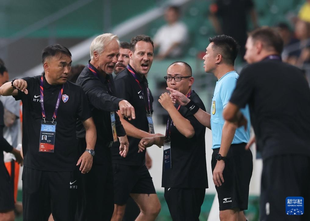 8月20日,云南玉昆队主教练约恩·安德森(左二)在比赛中向裁判抗议。