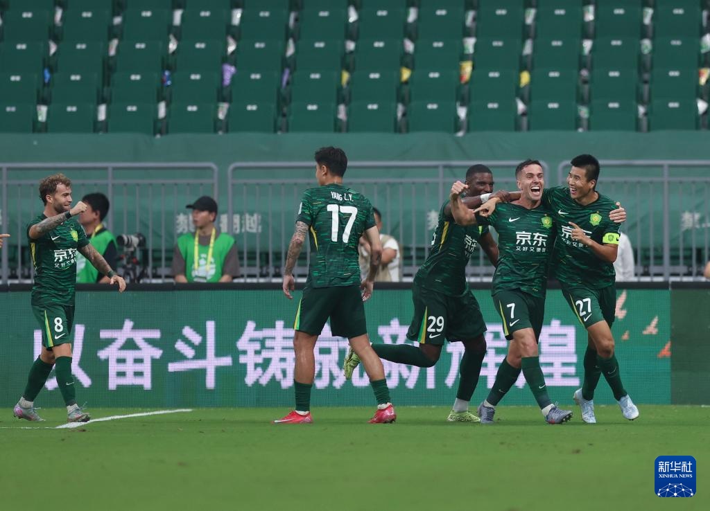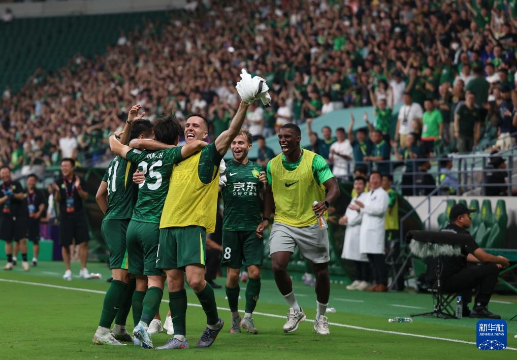 8月20日,北京国安队球员庆祝进球。
