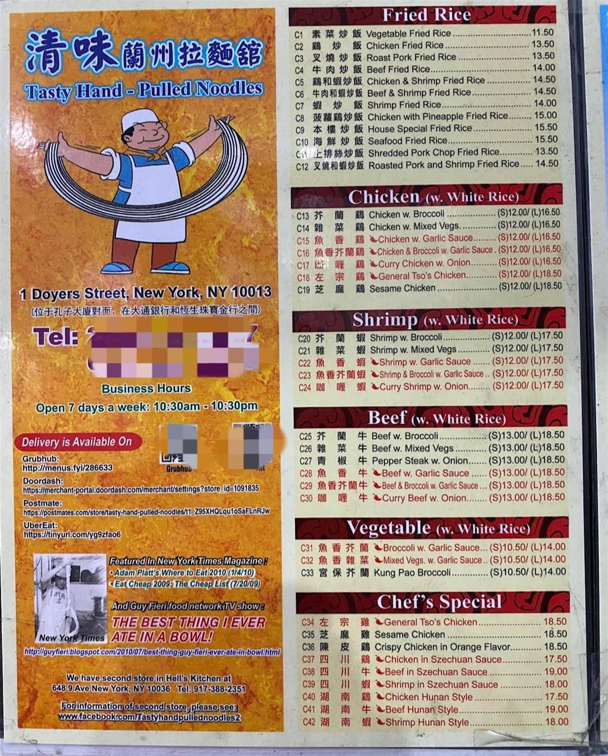 记者注意到,在该面馆的菜单上,有中文和英文两种语言,和大部分国外的中餐馆一样,都有部分改良过的菜品,如左宗鸡、湖南鸡等,价格大多在十几美元上下。