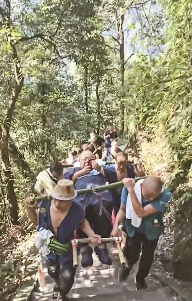 方先生称,坐滑竿的男子听口音像是江浙一带的人,在山上住了一晚,第二天才被抬下山。下山途中下了点雨,他也不介意,不要他们帮着撑伞,“我们抬他下山和下山,共用了差不多10多个小时,上山耗时会多一点。”到山脚后,该游客又善意地给了每人100元小费,最后总共给了22100元。