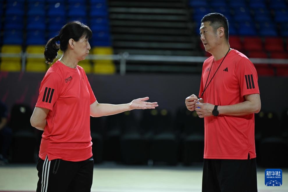 8月21日,国家体育总局排球运动管理中心主任赖亚文(左)与中国队主教练赵勇在训练中交流。