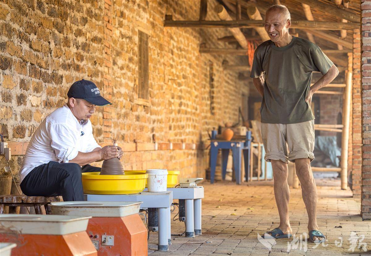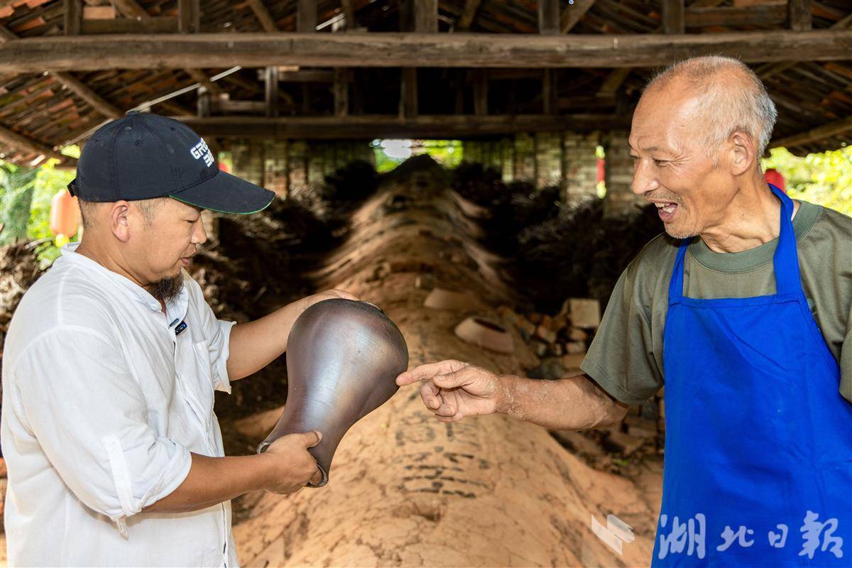 高全军凭借自己的理念与技术获得了老窑工们的认可,图为高全军与贾师傅交流陶器窑变效果。(湖北日报全媒记者 成熔兴 摄)
