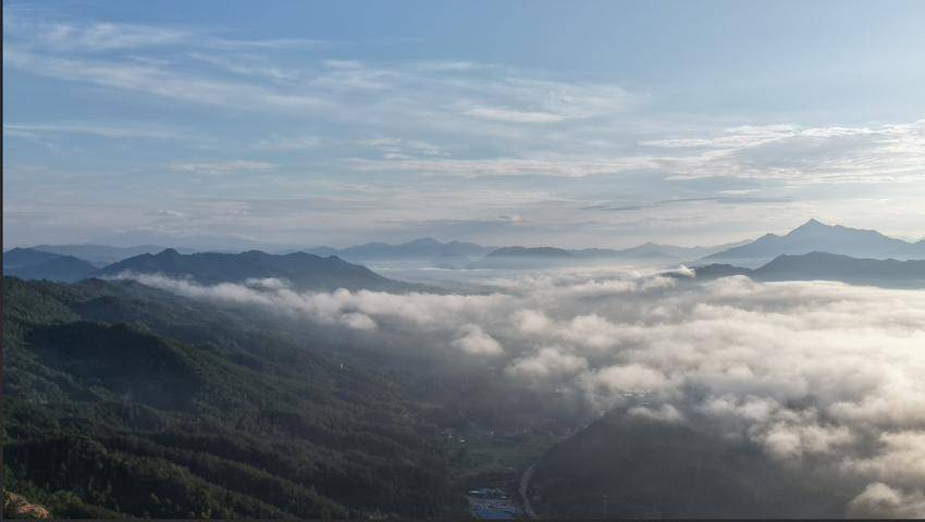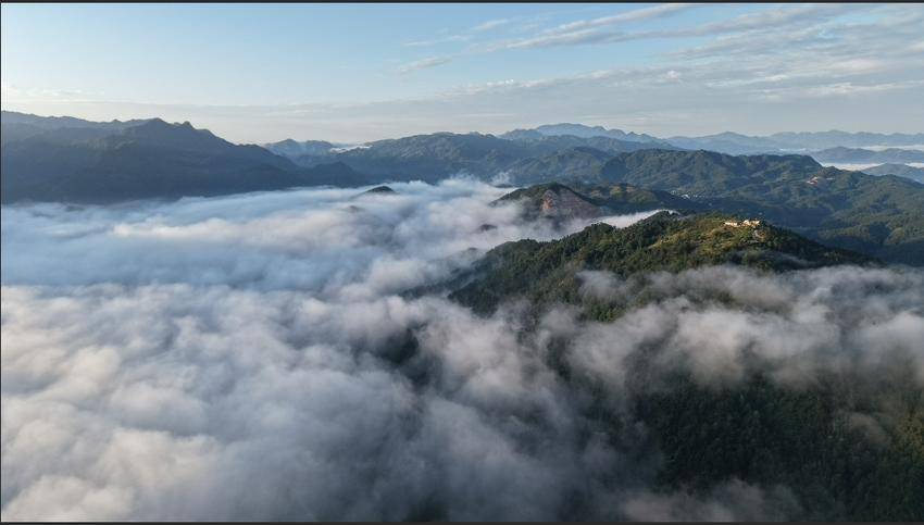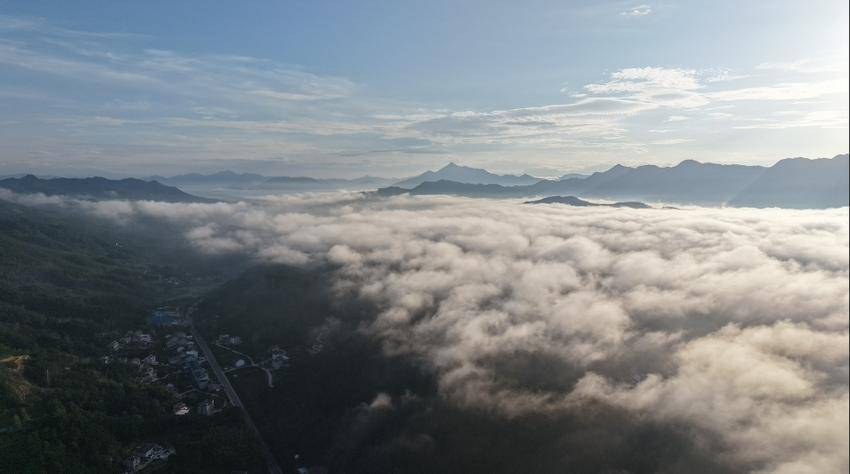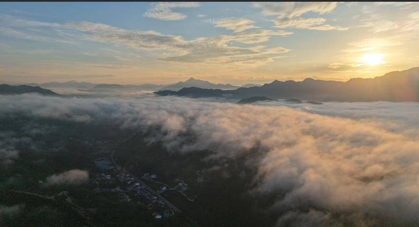 8月23日清晨,在英山县城区九龙山上出现了壮美的日出云海景观。一轮红日从层层叠叠的群山中冉冉升起,金色的阳光洒落在半山云海上,与山林、村庄、公路融为一体,如轻纱薄雾弥漫于山峦之间,波澜壮阔的云海画卷,宛如一幅壮美的水墨画卷。(湖北日报客户端通讯员 陈云峰)