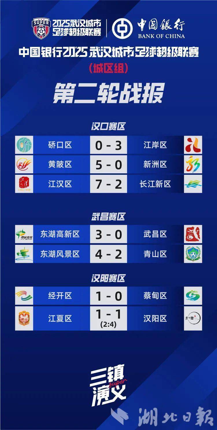湖北日报讯(记者汪洋)8月25日下午,2025武汉城市足球超级联赛(简称“汉超”)微信公众号公布城区组第二轮战报以及积分榜。