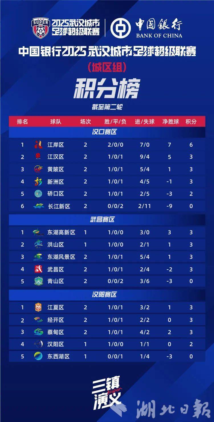根据最新积分榜,江岸区、东湖高新区、江夏区分列各赛区第一,长江新区、青山区、东西湖区暂时垫底。