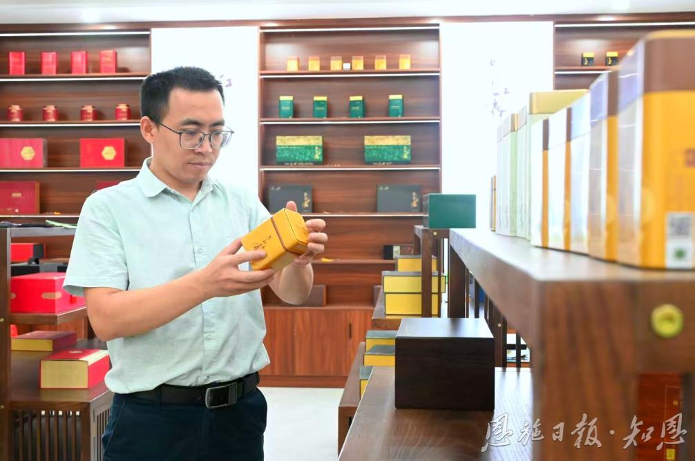 在产品陈列柜前,陈代明正在查看茶叶新品。