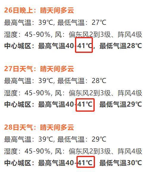 今起三天,41℃三连击!武汉中心城区最高气温40-41℃,低温在28-30℃。