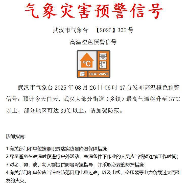 湖北日报讯(记者汤炜玮、实习生任康中、通讯员陈声超)8月26日,武汉市继续发布高温橙色预警信号,预计今天白天,武汉大部分街道(乡镇)最高气温将升至37℃以上,部分地区可达39℃以上,请加强防范。