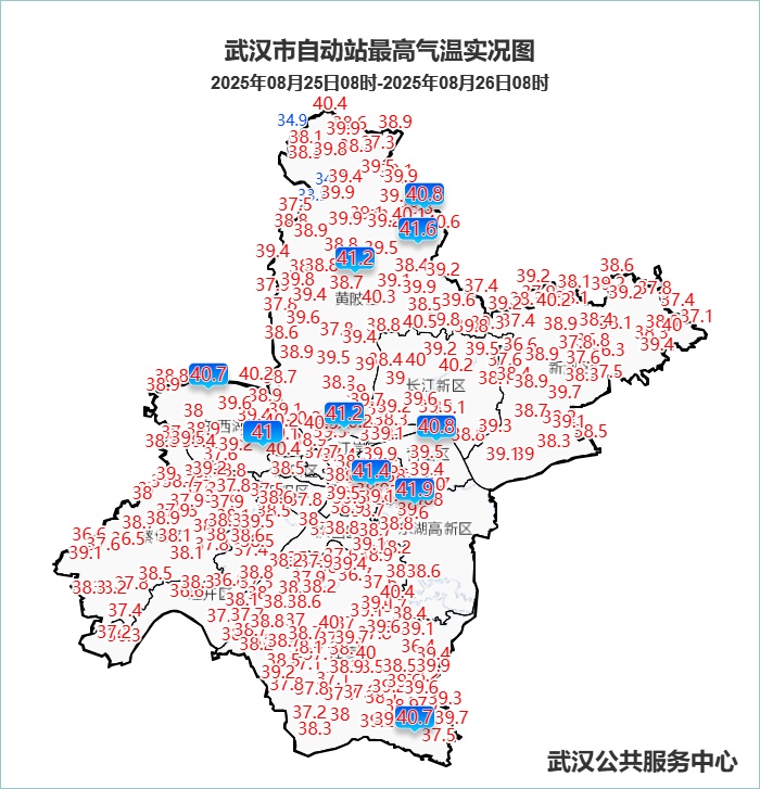 昨天武汉市晴天到多云,下午局地出现阵雨,累计雨量均在4mm以下,最高气温大部38~41℃。全市320个自动站中,39~40℃为88站,40℃(含)以上33站,最高为东湖高新射击场站41.9℃。