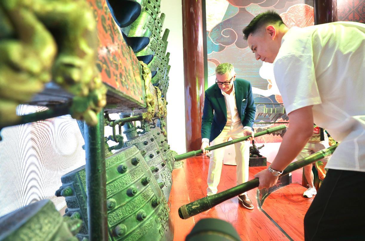 傍晚时分,球员们从楚风园开始此次文化之旅。东湖绿道游人如织,湖风轻拂,水波微漾,自然风光与远处城市天际线浑然一体。球员们纷纷拿出手机,记录下这惬意一刻。抵达楚天台时,正值夕阳西下。球员们步入这座仿古高台,被其雄浑的楚建筑风格和厚重的历史氛围所吸引。随后,一场精心编排的楚文化文艺表演拉开帷幕。演出中,编钟演奏的《橘颂》《高山流水》《欢乐颂》等经典曲目回荡于湖山之间,令人仿佛穿越时空,感受千年文明的脉搏。最让球员们跃跃欲试的环节是亲手敲响编钟。在工作人员的指导下,世界职业比利与斯诺克协会主席福泽盛、卫冕冠军肖国栋小心拿起钟槌,尝试击打出清越的音符。