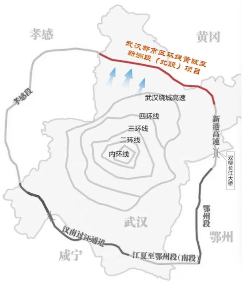 作为省、市、区三级重点项目,武汉都市圈环线高速公路(武汉六环线)全长约215公里,采取分段分步实施策略。黄陂至新洲段全长66.12公里,按双向六车道高速公路标准建设,设计时速120公里,共设置木兰互通、王家河互通、蔡家榨互通等8个互通,建成后将串联武汉北部与东部区域,打通跨市交通脉络。