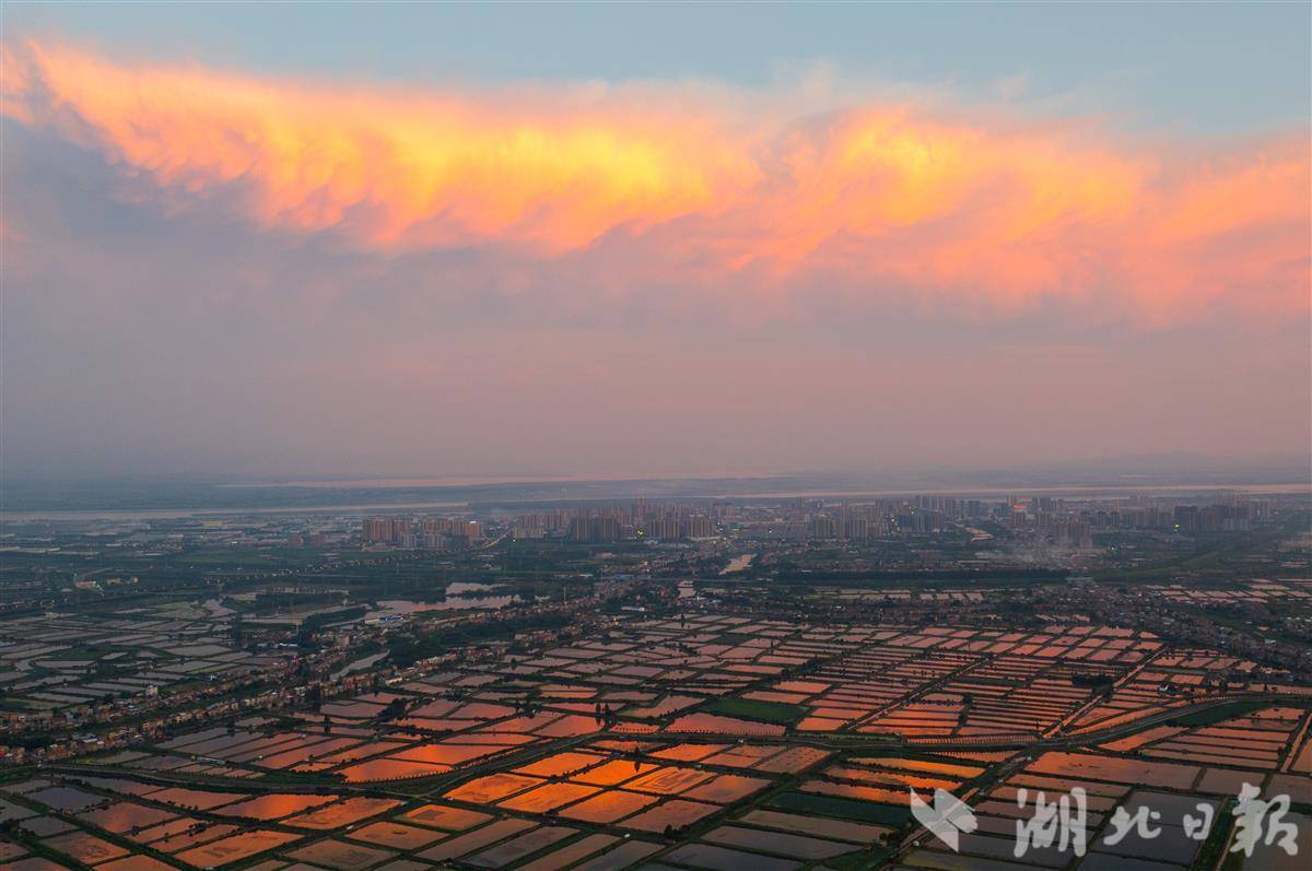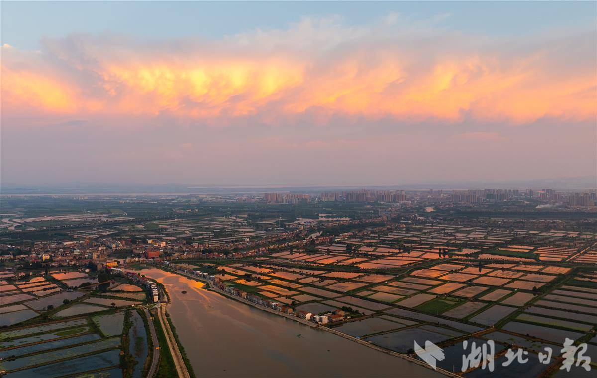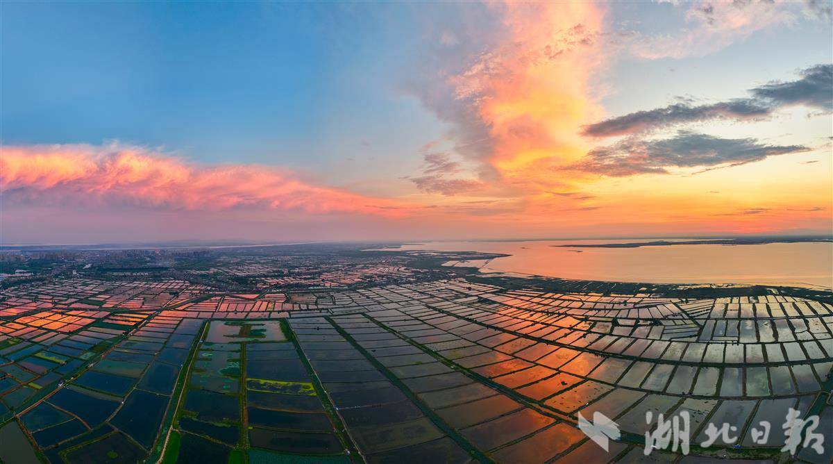 8月27日 ,洪湖迎来绝美落日晚霞。航拍视角下,水乡特色田块如明镜,倒映落日余晖与天际云霞,勾勒出一幅美丽的生态画卷,尽显水乡独特魅力 。(湖北日报全媒记者 薛婷 摄)