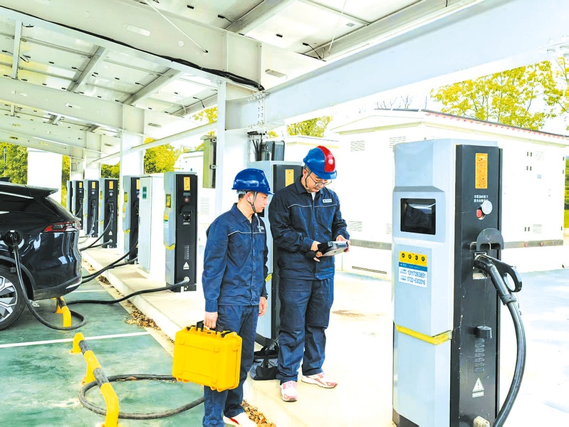 图为国网广水供电公司工作人员对十里街道观音村充电桩设备及配电柜装置进行检测。(随州日报通讯员 丁孟秋摄)