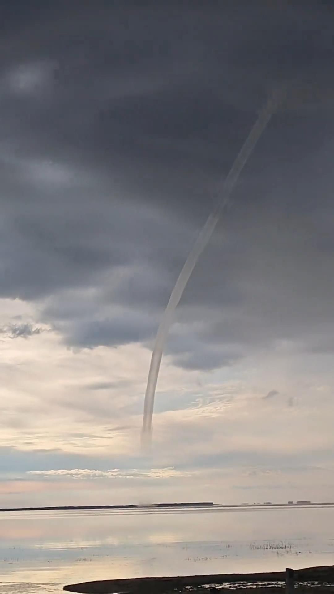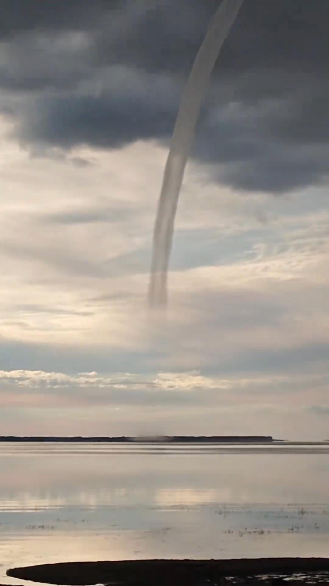 视频画面显示,从远处看,一道圆形水柱连接天地,直冲云霄。待视频拍摄者靠近后可以看到,水柱的另一端与水面相连,湖中的水被水柱吸附着向上盘旋升空。