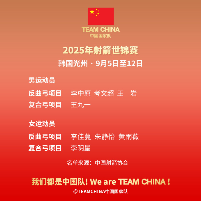 2025射箭世锦赛中国队参赛名单。图片来自中国国家队官方社交账号