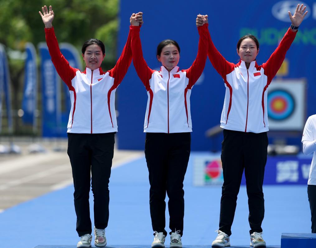 5月11日,亚军中国队选手黄雨薇、李佳蔓、朱静怡(从左到右)在2025射箭世界杯上海站女子反曲弓团体赛颁奖仪式上。新华社记者 王翔 摄
