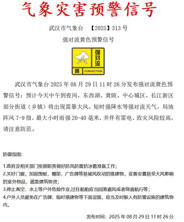 湖北日报讯(记者汤炜玮、实习生任康中、通讯员陈声超)刚刚,降温雨抵达武汉!8月29日11时26分发布强对流黄色预警信号:预计今天中午到夜间,东西湖、黄陂、中心城区、长江新区等地部分街道(乡镇)将出现雷暴大风、短时强降水等强对流天气,局地阵风7-9级,最大小时雨强20-40毫米,并伴有雷电,致灾风险较高请注意防范。