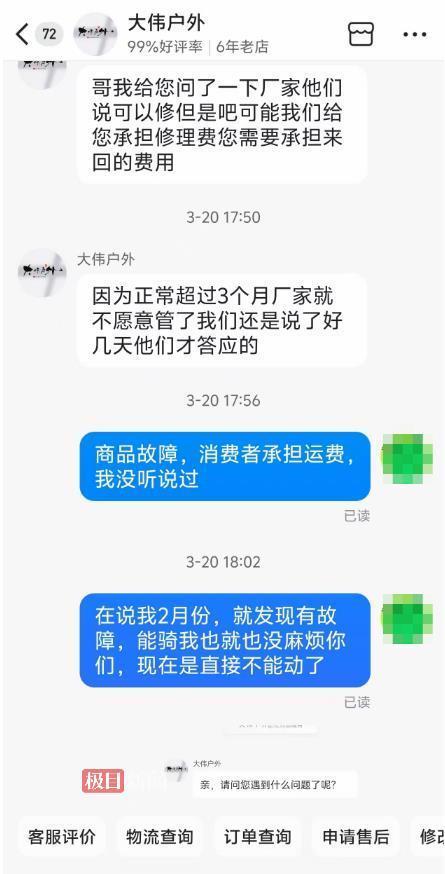 随后,记者根据店铺主页显示的客服联系方式,拨打了“大伟户外”的客服电话,在表明身份及来意后,客服表示:“关于明先生的问题,我们之前已多次与他协商。我们提出让他先找维修店,费用由我们承担,但他称找不到能维修的店铺。之后我们联系厂家同意维修,他又不愿承担运费,因此一直未能达成一致。”