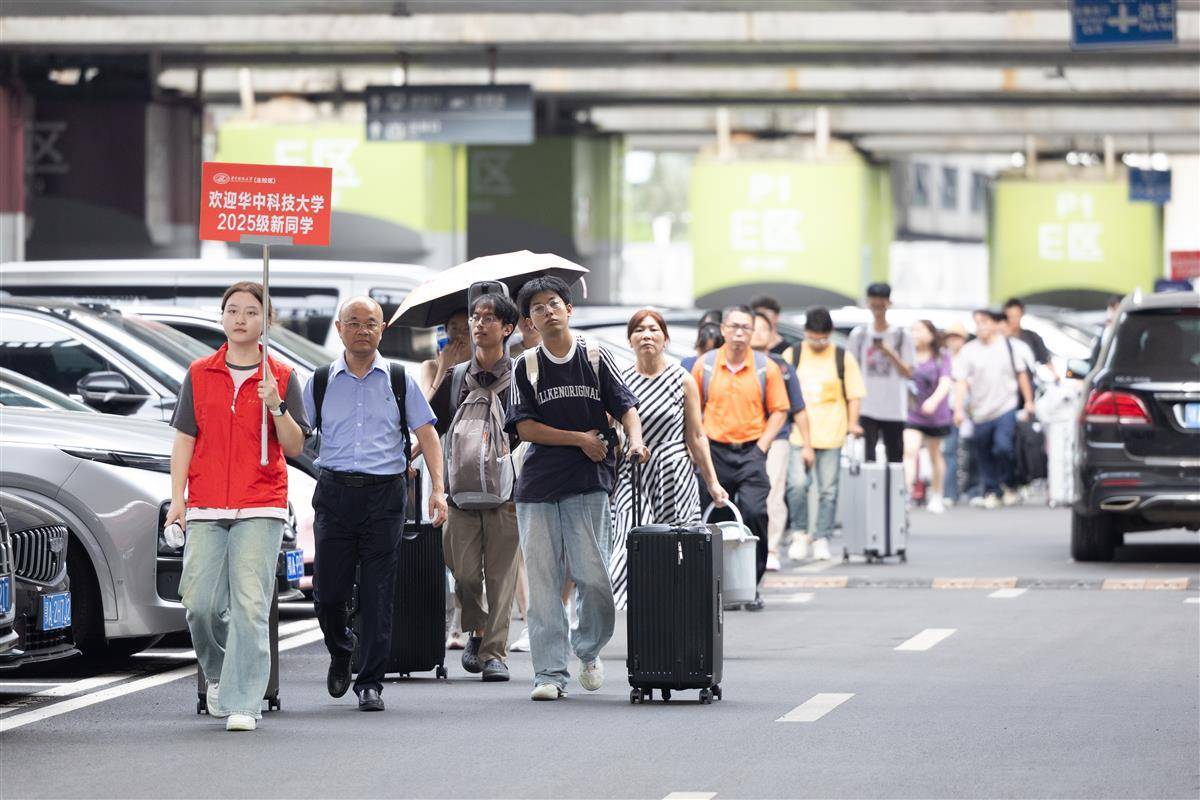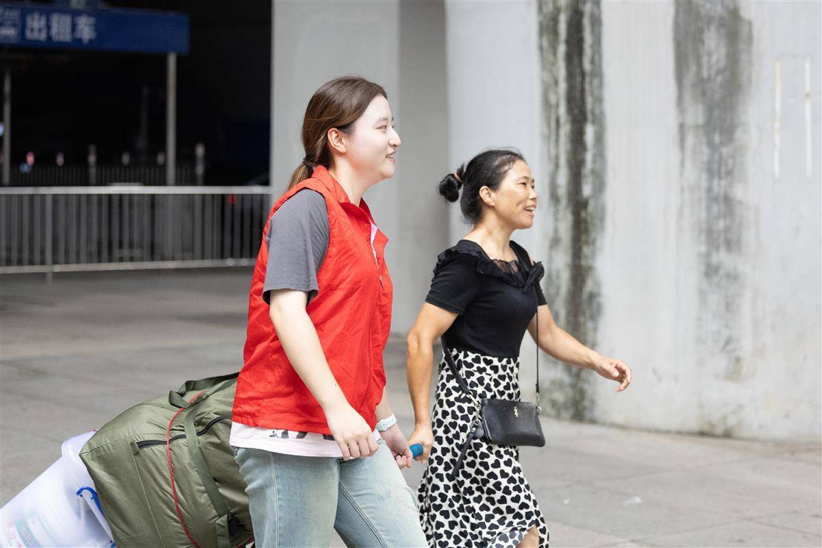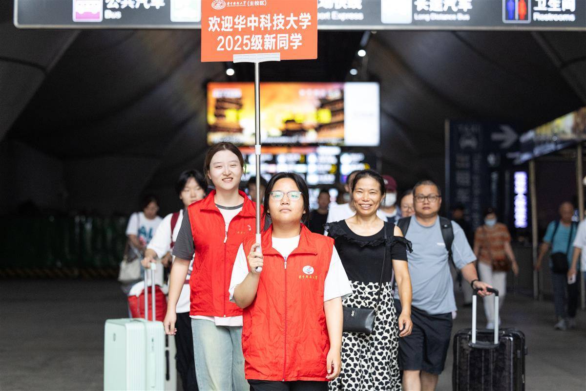 2025年8月29日,武汉火车站,华中科技大学迎新志愿者在出站口热情迎接新生。当天,学校组织了420余名志愿者和数十辆迎新大巴,在火车站、汽车站等交通枢纽开展“一站式”接站服务,确保新生及送新家长顺利抵校。(湖北日报全媒记者 何宇欣 通讯员 左盈 摄)
