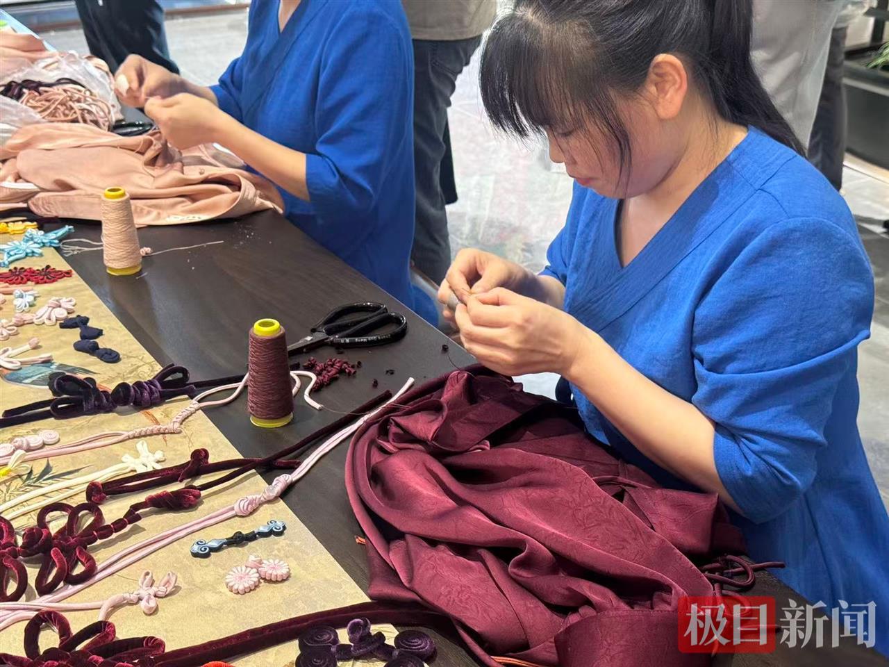 “这些年,我们对手艺从不敢含糊。”闵秀华说,古法裁剪的规矩、手工盘口的工艺、绣花工艺的细致,秀华道源每一步都照着老祖宗的方法来。比如缝制一颗扣子,必须用三股线,再缝19针,除了结实,也包含“三生万物”和“九为老阳”等道家文化。