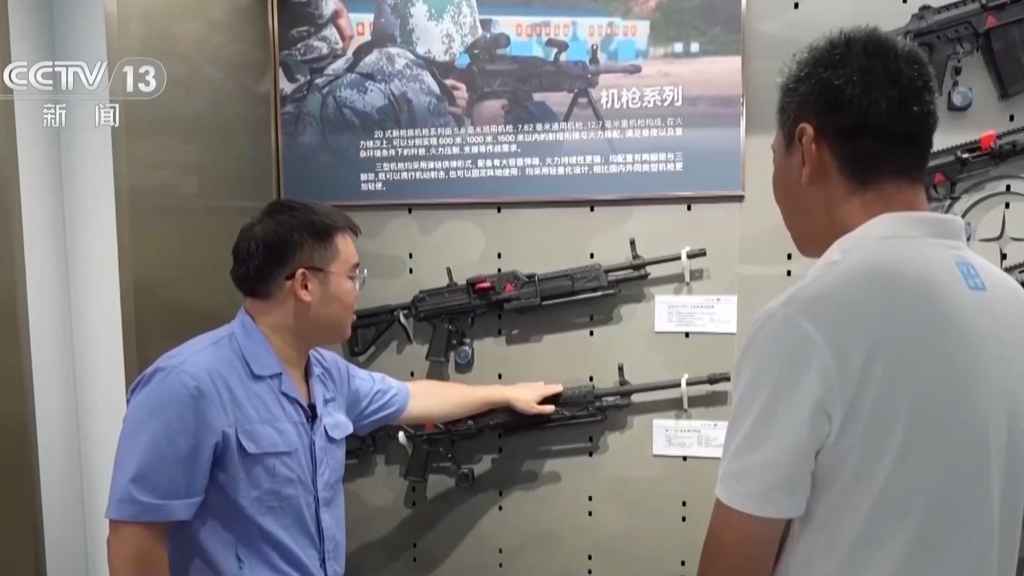 王洋:中间的这一款是201式7.62毫米的通用机枪,重量非常轻,使用起来就比较方便。与此同时,它还采用了所谓的混合后坐原理,它的枪管在射击的时候可以小幅度地去后坐,可以缓和枪械射击时的后坐力。