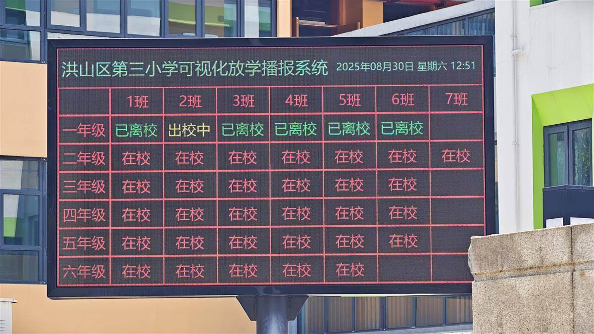 午间放学的科技范儿成为亮点:校门电子屏滚动播放语音“一(2)班正在离校”,电子显示屏实时更新班级离校动态,家长按班级标识在指定区域有序等候,全程未出现拥堵现象。一位新生家长感慨:“从开设体验课到离校管理,处处能感受教育温度。”(湖北日报全媒记者 陈少哲 摄)