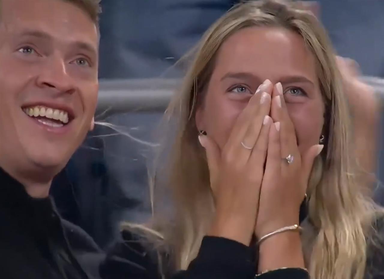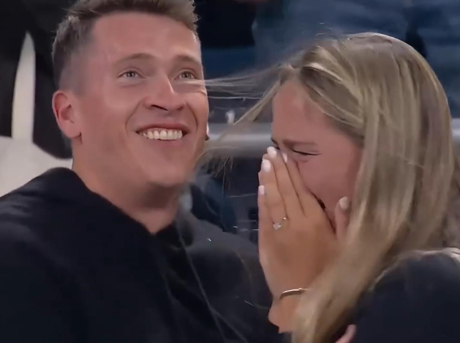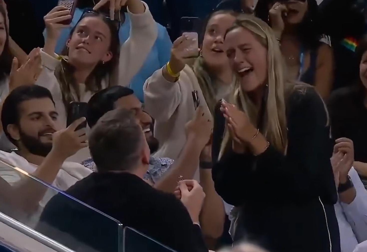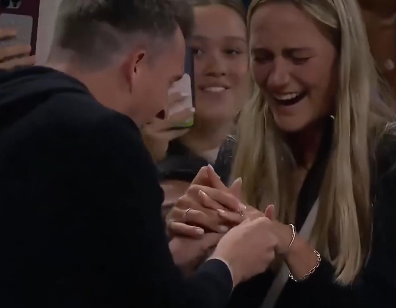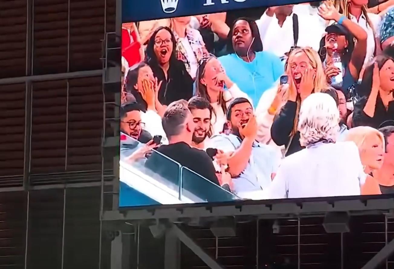 2025美网上演浪漫一幕——北京时间8月30日上午,美网第三轮焦点战,萨巴伦卡和费尔南德斯的比赛局间休息时,观众席上,一名小伙突然掏出一枚大钻戒,向女友求婚。