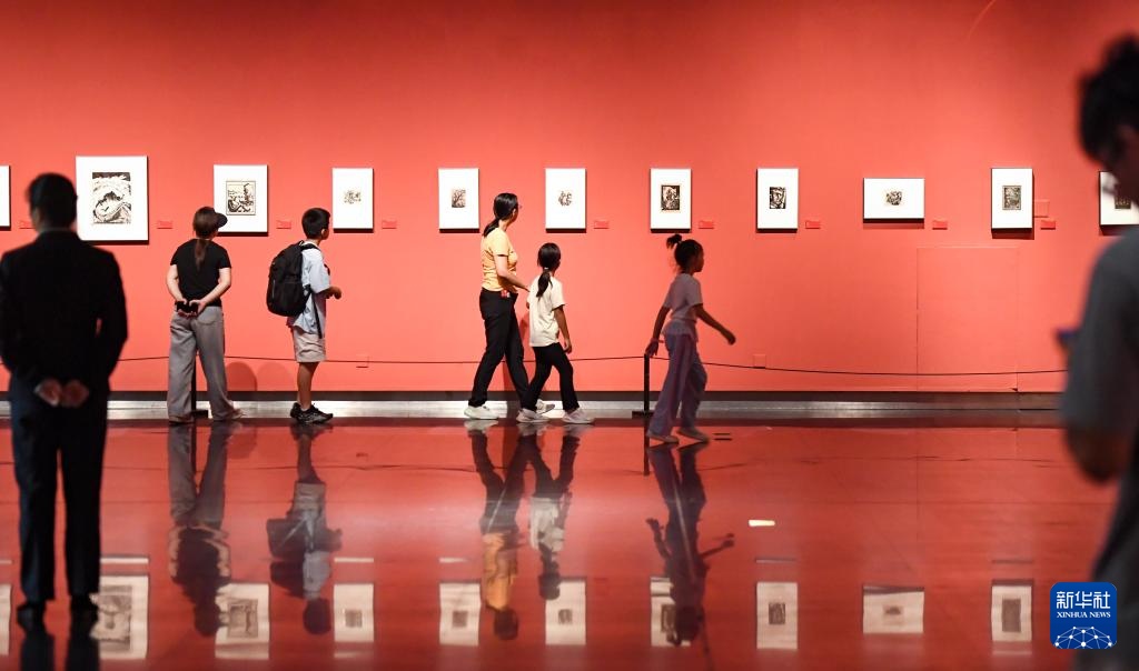 8月24日,学生在家长陪同下在江苏省美术馆观看抗战主题美术作品展。