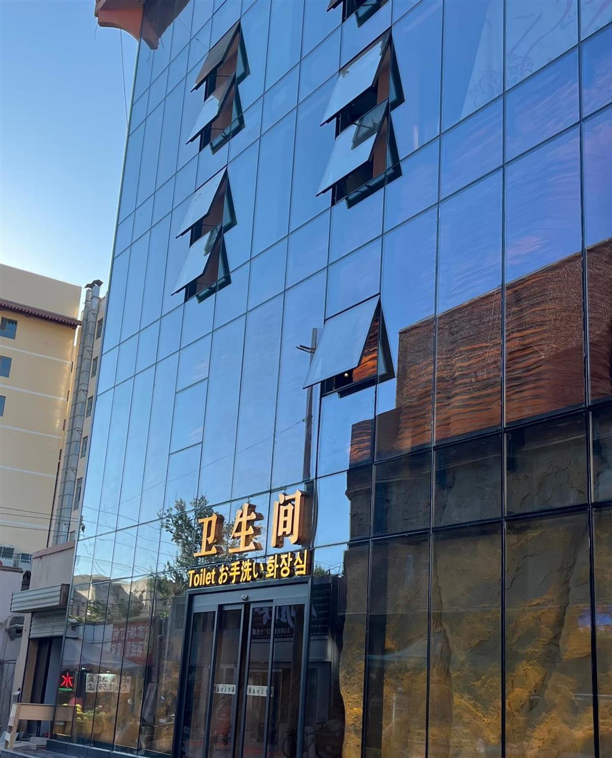 据了解,敦煌净界公共文化空间是由敦煌文旅集团联合某卫浴品牌共同打造的。敦煌文旅的工作人员向记者表示,“敦煌净界”公共卫生间共有两层,一层以“莫高至善”为主题,融入敦煌文化;二层呈现“雅丹秘境”,营造雄浑奇幻的空间意境。外立面创新升级为超白玻璃幕墙,与毗邻的沙州楼形成“古今对话”,成为敦煌文化新IP。