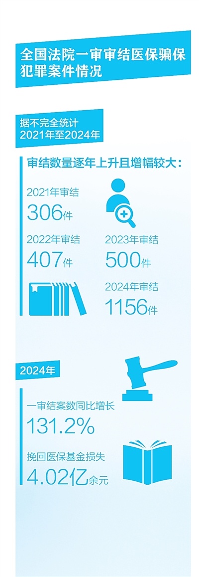 2024年,全国法院一审审结医保骗保犯罪案件1156件,判处罪犯2299人,一审结案数同比增长131.2%,挽回医保基金损失4.02亿余元。