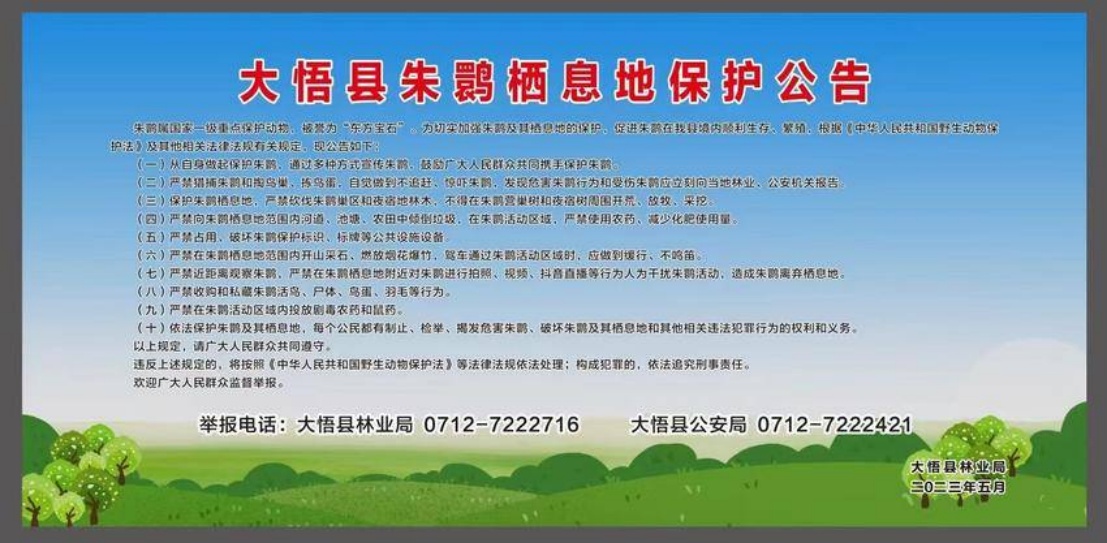大悟常态化开展野外朱鹮巡护监测,新发现的栖息地由属地派出所、林站和村委会共同负责管理。通过广泛宣传,群众保护野生动物的意识显著提高,逐步形成完整的朱鹮保护网络。