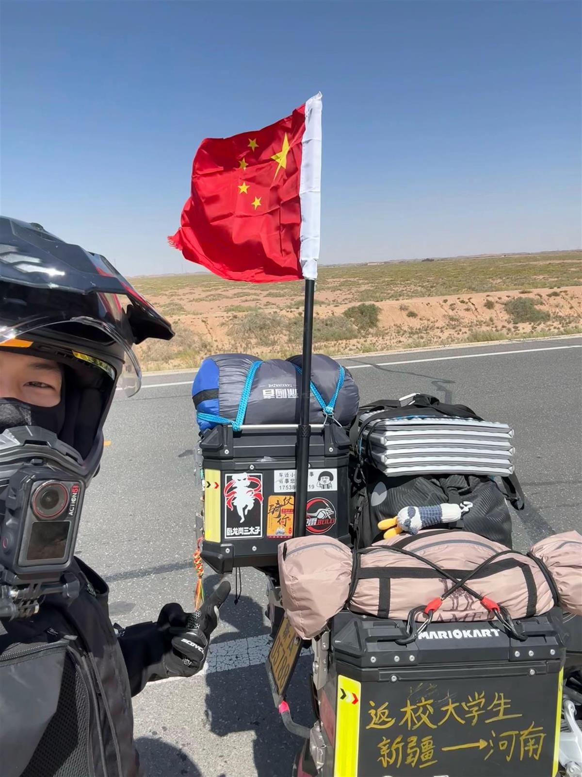郭旭是郑州科技学院的大三学生,今年23岁,大一暑假,他报名参军,两年后退役,去年9月重新回校读大二。每次长途摩旅,他都在摩托车上挂国旗,让这一抹红色历经风雨而愈加鲜艳,陪伴自己的旅程。