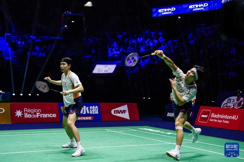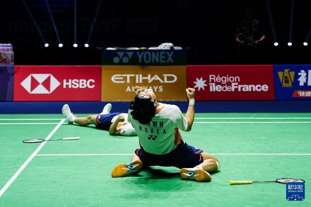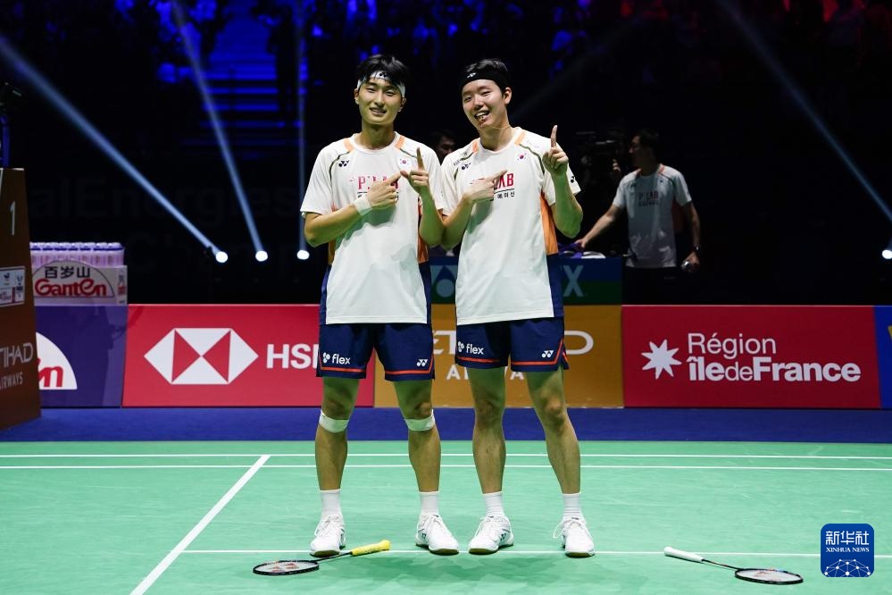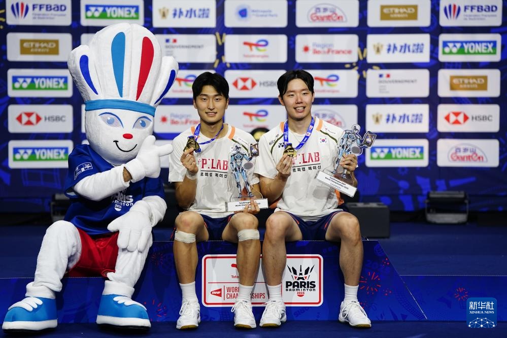 当日,在法国巴黎举行的2025年世界羽毛球锦标赛男子双打决赛中,韩国组合金元浩/徐承宰2比0战胜中国组合陈柏阳/刘毅,获得冠军。