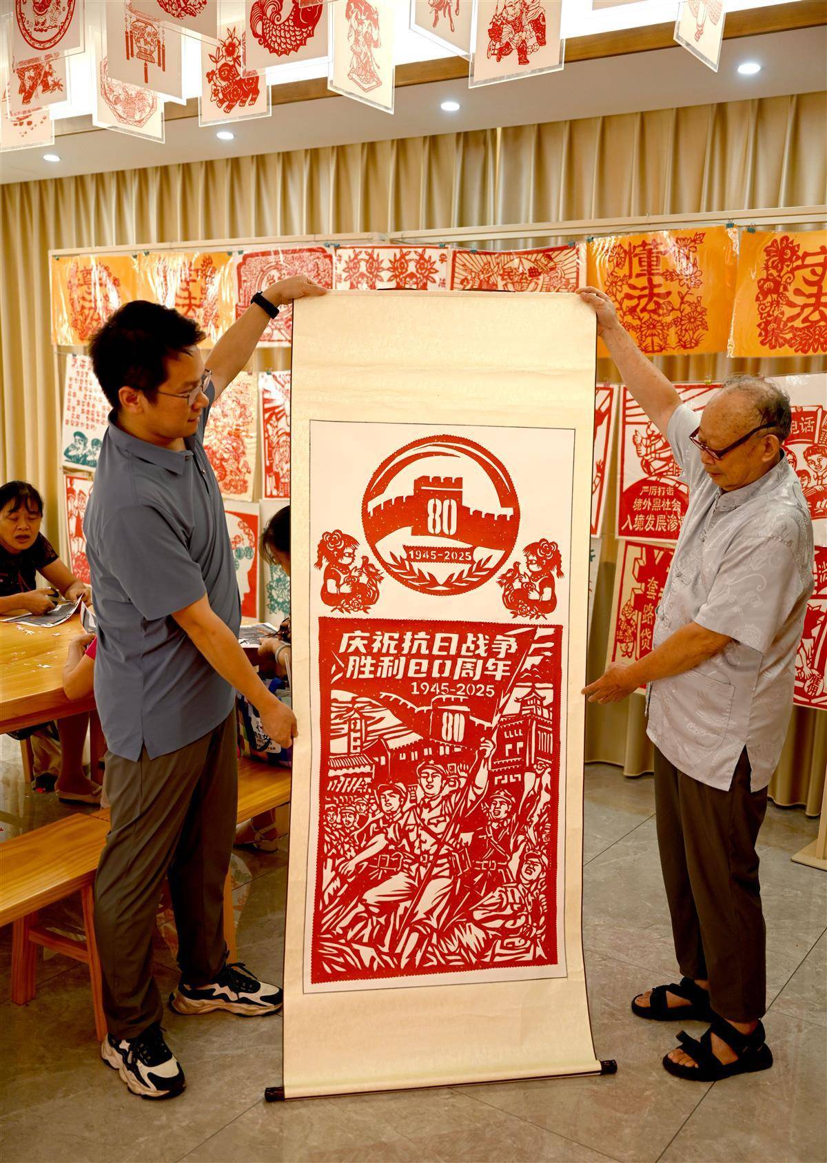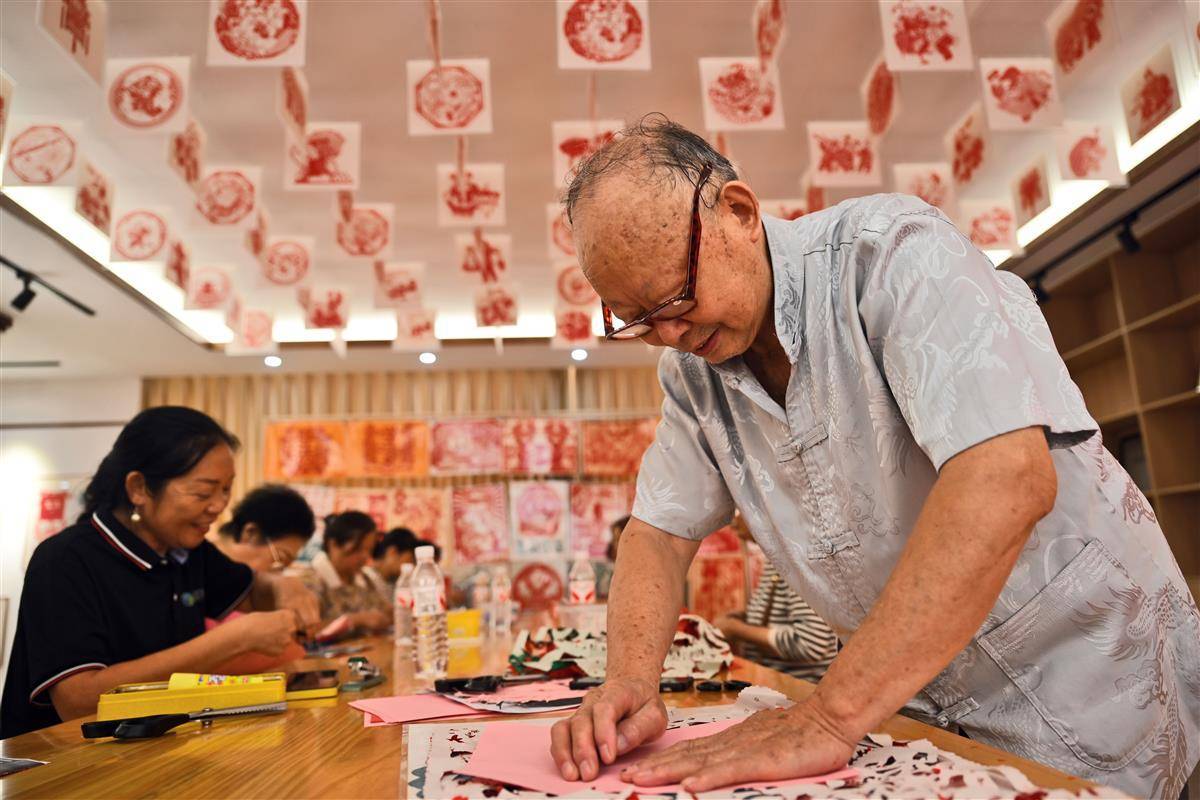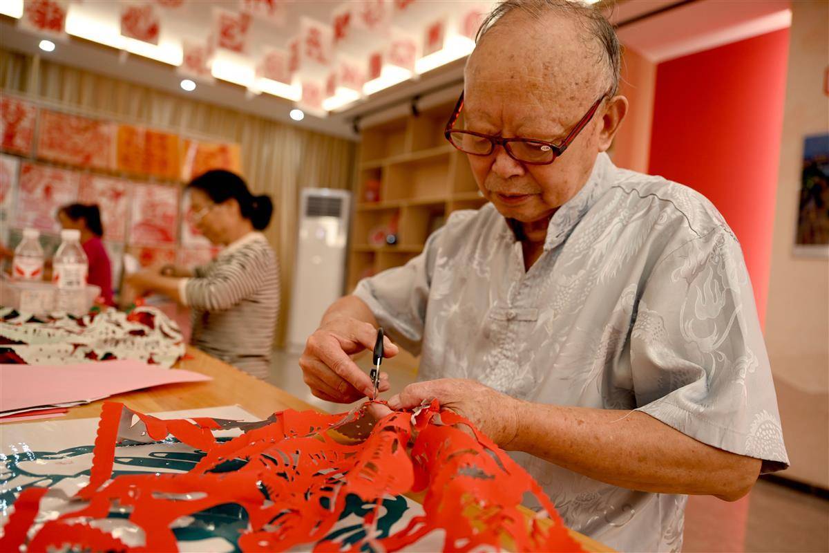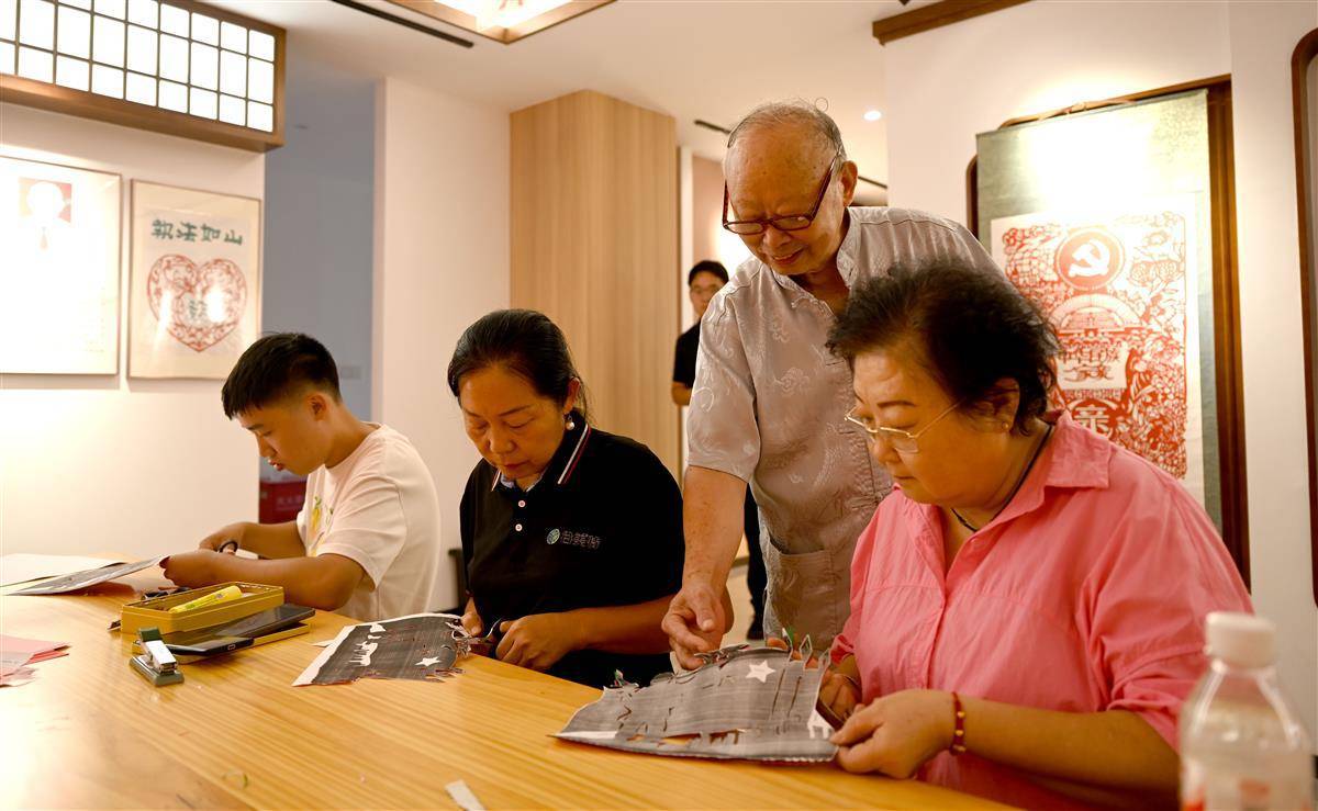 9月1日,在宜都市陆城街道锦江社区活动室里,76岁的退伍老兵、剪纸艺人艾道新正耐心地向居民传授剪纸技艺。只见他手中红纸轻转,剪刀穿梭,不一会儿,一个个英气勃勃的抗战人物形象与象征和平的白鸽便跃然纸上。精湛的技艺引得在场居民赞叹不已,大家不仅现场体验到了非遗剪纸的独特魅力,也接受了一次生动的爱国主义教育。