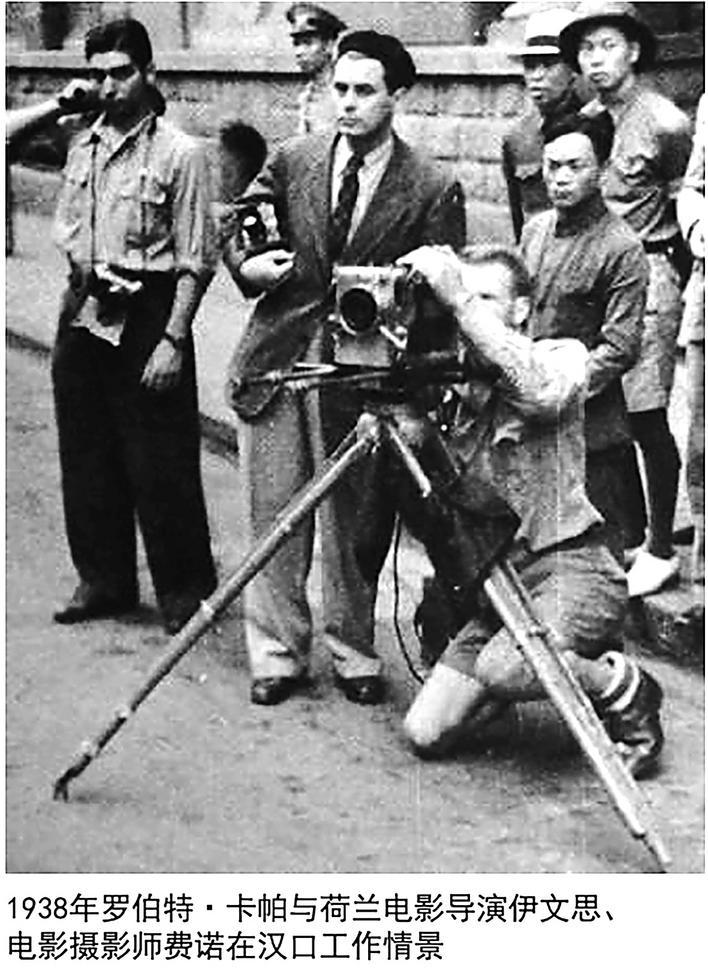 1938年,匈牙利裔美籍战地摄影大师罗伯特·卡帕与荷兰电影导演伊文思、摄影师费诺在汉口街头拍摄。 (资料图片)
