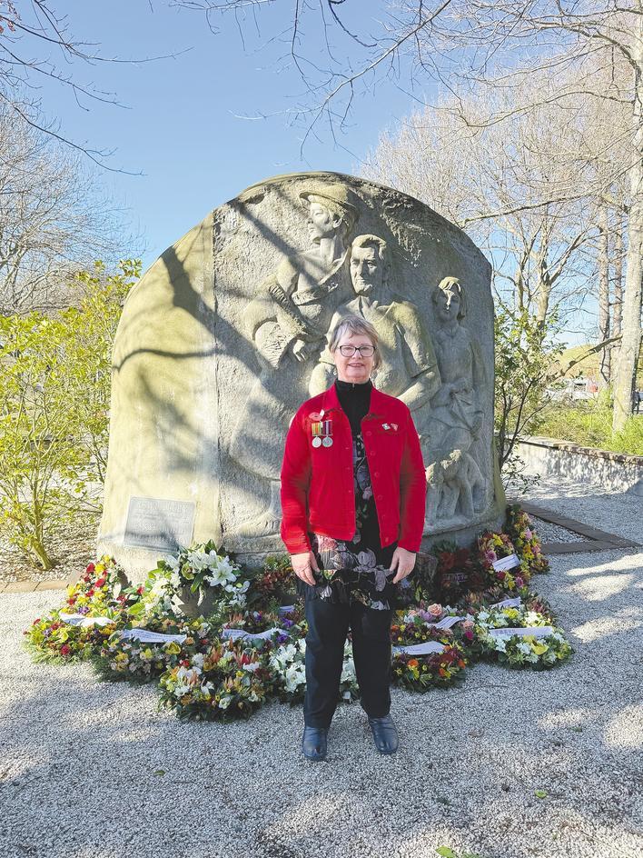 8月15日,新西兰斯普林菲尔德镇,人们在路易·艾黎纪念碑前献上花圈,纪念中国人民抗日战争暨世界反法西斯战争胜利80周年。图为路易·艾黎的侄女乔斯林·艾利·沃特金特意留影纪念。 (受访者供图)
