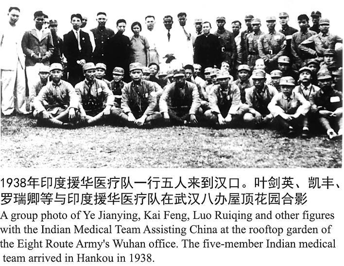 1938年,印度援华医疗队一行来到汉口,叶剑英、凯丰、罗瑞卿等人和他们在八路军武汉办事处屋顶花园合影。 (资料图片)